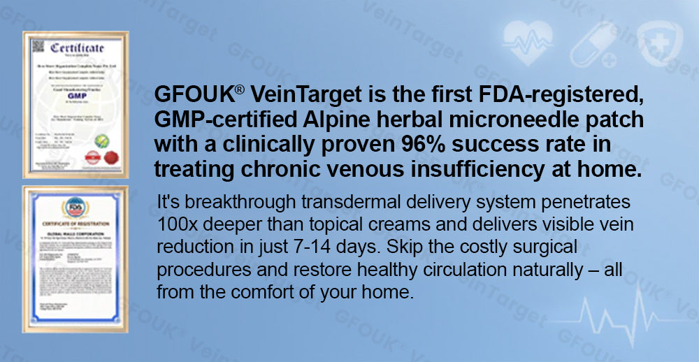 GFOUK® VeinTarget is the first FDA-registered, GMP-certified Alpine herbal microneedle patch with a clinically proven 96% success rate in treating chronic venous insufficiency at home. Its breakthrough transdermal delivery system penetrates 100x deeper than topical creams and delivers visible vein reduction in just 7–14 days. Skip the costly surgical procedures and restore healthy circulation naturally – all from the comfort of your home.
